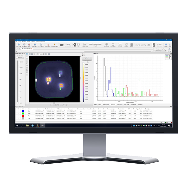 當照明設備或電子板使用不同顏色的LED時,可以將標準OPTICAM 2.0 4K TEC亮度計與GL SPECTIS 1.0觸摸光譜儀結(jié)合使用,以支持亮度和顏色測試與評估。GL SPECTROSOFT具有將亮度攝像機的測量結(jié)果與光譜輻射測量結(jié)果結(jié)合起來的選項。結(jié)果,可以能夠提供亮度值的失配校正以獲得最高的精度,并提供被測LED產(chǎn)品的所有比色和光譜數(shù)據(jù)。